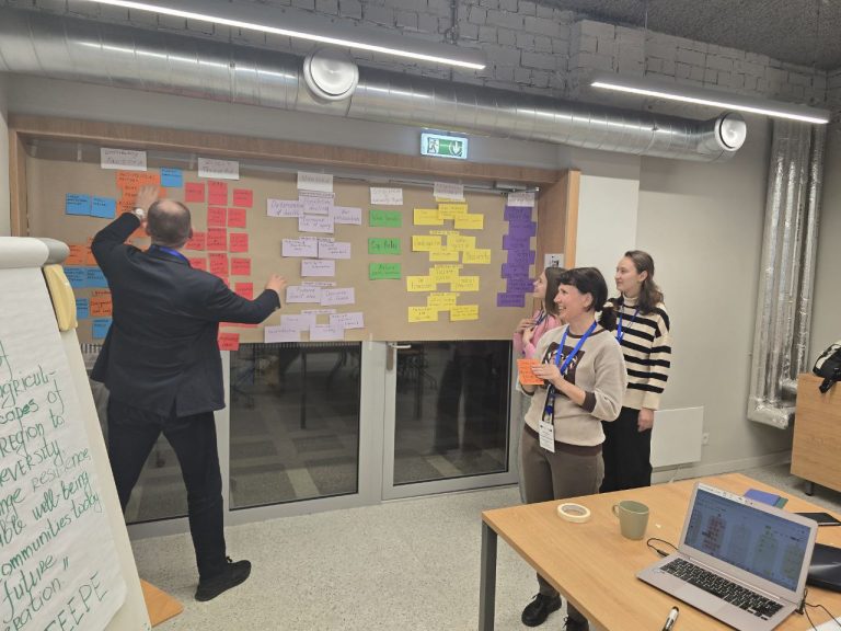 Другий тиждень відбувався безпосередньо в кампусі VILNIUS TECH. Тут міжнародні команди удосконалили свої моделі та перенесли роботу в аналоговий світ, використовуючи кольорову бумагу, ручки та скотч. Цей тиждень був присвячений творчому розвитку проєктів через побудову теорій змін і початок точного налаштування діяльності для забезпечення успішного впливу. Робота призвела до створення чотирьох пілотних проєктів для різних природних зон України – Карпат, Полісся, Лісостепу та Степу. Вони включають створення рекреаційних та освітніх просторів для реабілітації ветеранів, ініціативи з екологічної обізнаності, дорожню карту для інструменту фінансування розмінування сільськогосподарських територій та заходи із збереження водного біорізноманіття. Усі команди успішно презентували свою роботу та отримали сертифікати участі.