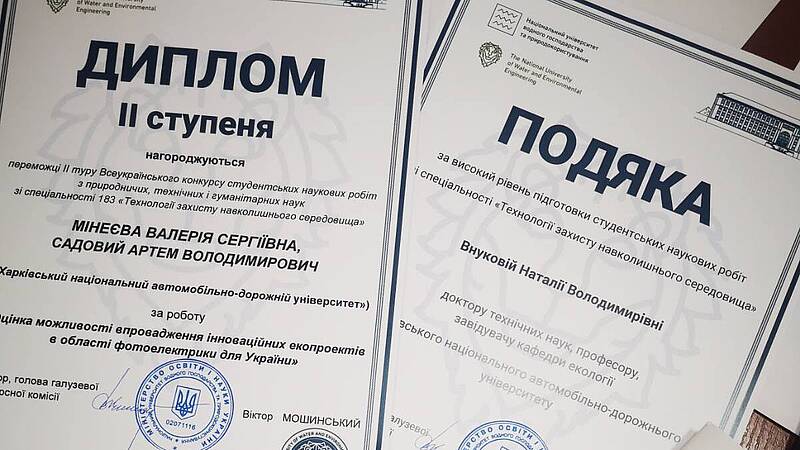 5. Всеукраїнський конкурс наукових робіт за спеціальністю «Технології захисту навколишнього середовища» (проходив 20-22 квітня 2021 року на базі Національного університету водного господарства та природокористування) – Диплом ІІ ступеня вибороли Валерія Мінеєва (ДЕ-31-18) та Садовий Артем (ДЕ-41-17) під керівництвом завідувача кафедри екології, проф. Внукової Наталії Володимирівни.