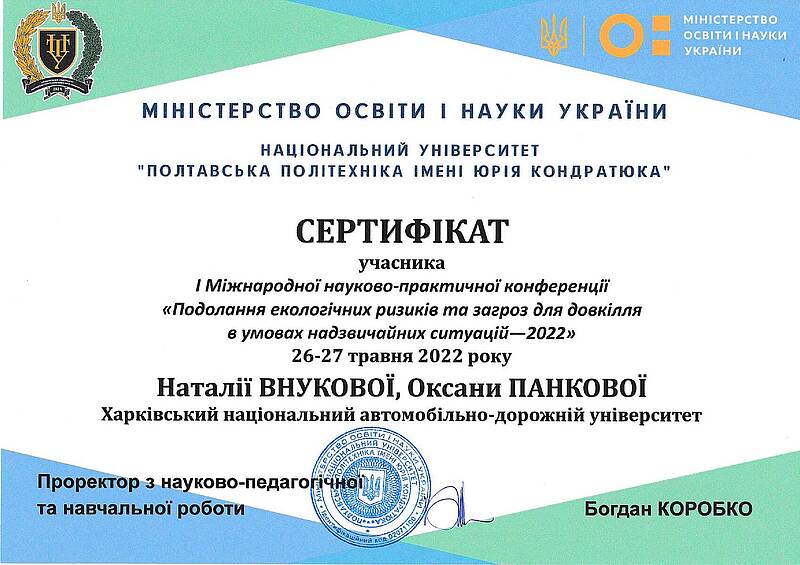 26 травня 2022 р. відбулось відкриття І міжнародної науково-практичної конференції «Подолання екологічних ризиків та загроз для довкілля в умовах надзвичайних ситуацій - 2022» на базі Національного університету «Полтавська Політехніка імені Юрія Кондратюка» за участі більш ніж двадцяти відомчих установ та університетів держави та світу, серед яких Харківський національний автомобільно-дорожній університет. В конференції прийняли участь науковці кафедри Екології Харківського національного автомобільно-дорожнього університету, завідувач кафедри, д.т.н., професор Н.В. Внукова, доцент кафедри, к.с-г.н. О.В. Панкова, аспірант кафедри К.М. Ханейчук.