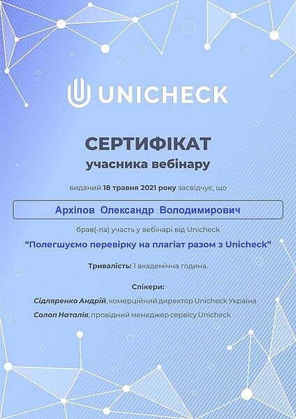 18 травня викладачі кафедри проф. Черніков О.В. та доценти Архіпов О.В. та Рагулін В.М. прийняли участь у Всеукраїнському вебінарі щодо сервісу перевірки на плагіат за допомогою платформи Unicheck («Полегшуємо перевірку на плагіат разом з Unicheck», unicheck.com/uk-ua ), на якому було розглянуто всі аспекти перевірки текстів на наявність плагіату та запозичень і реальний досвід закладів освіти про онлайн-перевірки та впровадження академічної доброчесності.