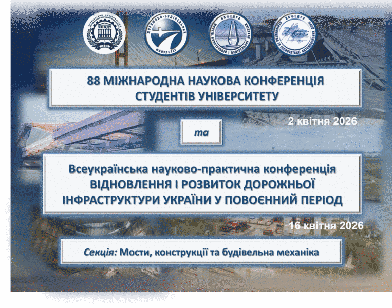 У квітні 2026 року на кафедрі мостів, конструкцій і будівельної механіки ім. В.О. Російського Харківського національного автомобільно-дорожнього університету відбулася низка важливих наукових заходів, що об’єднали студентів, викладачів, аспірантів та фахівців галузі. 2 квітня 2026 року пройшла 88-ма Міжнародна наукова конференція студентів університету, у межах якої здобувачі освіти представили результати своїх досліджень, присвячених актуальним проблемам мосто- та тунелебудування. Учасники продемонстрували високий рівень підготовки, а представлені доповіді викликали жваве обговорення. 16 квітня 2026 року відбулося засідання секції кафедри в рамках Всеукраїнської науково-практичної конференції «Відновлення і розвиток дорожньої інфраструктури України у повоєнний період». Під час роботи секції були розглянуті ключові питання відновлення мостових споруд, впровадження інноваційних рішень, застосування BIM-технологій та підвищення довговічності транспортної інфраструктури в сучасних умовах. Проведені заходи сприяли активізації науково-дослідної діяльності студентів і викладачів, обміну досвідом та формуванню сучасного бачення розвитку галузі в умовах післявоєнної відбудови.